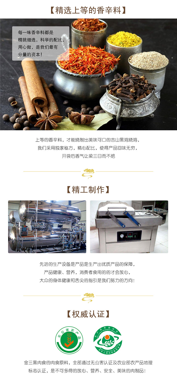 产品主要有用莱芜黑猪、莱芜黑山羊、莱芜吉山黑鸡、莱芜黑兔生产的冷鲜食品、调理食品及熟食制品